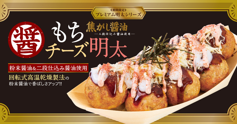 毎年人気の「焦がし醤油もちチーズ明太」。特製の「焦がし醤油だれ」は、粉末醤油と二段仕込み醤油を組み合わせることで、醤油の旨味とコク、そして香ばしさをより一層引き立てる味わいに仕上がっています。この香ばしい醤油だれが、とろとろの「もちソース」と相性抜群です。