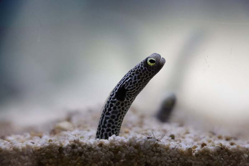 2階「MARINE NOTE(マリンノート)」では、愛嬌いっぱいのチンアナゴたちが砂の中から顔を出し、ゆらゆらと揺れる様子を間近で観察できます。