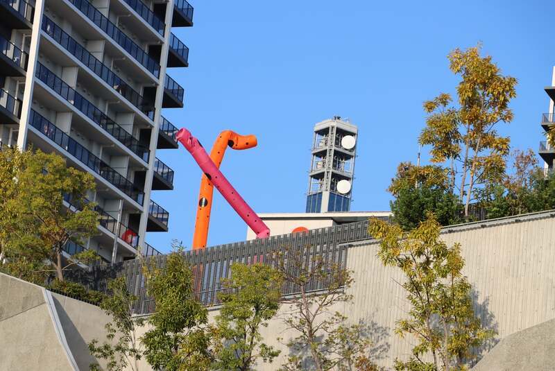 神戸ポートミュージアムの屋上には、白・オレンジ・ピンクの3匹のチンアナゴ型エアーダンサーが設置されます。全長約8mもの大きさで、まるで砂から顔を出しているかのように、空に向かって立ち上がる姿を見ることができます。
