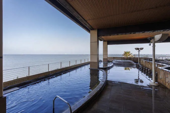 富士の湯など多彩なお風呂からは東京湾を一望でき、室内プールには人気の70mウォータースライダーや音楽噴水ショーもあります。