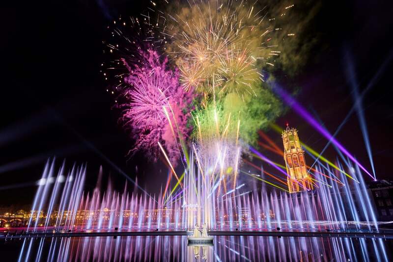 最大20mの高さまで打ち上がる噴水、ドムトールンから放たれるサーチライトによって夜空から光が降り注ぎ、フィナーレには視界いっぱいに花火が打ちあがります。