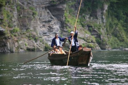 親鼻橋から岩畳までの3kmコースと、岩畳から高砂橋までの3kmコースがあり、熟練の船頭による巧みな竿さばきと軽快なトークが魅力。