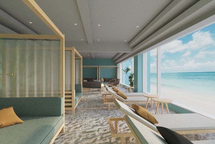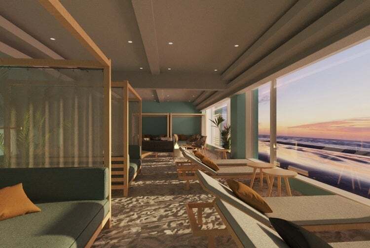 足元に白い砂が広がる「ビーチラウンジ」では、まるでビーチにいるような感覚でくつろげます。解放感のある窓からは、時間帯によって異なる海の表情を楽しめます。