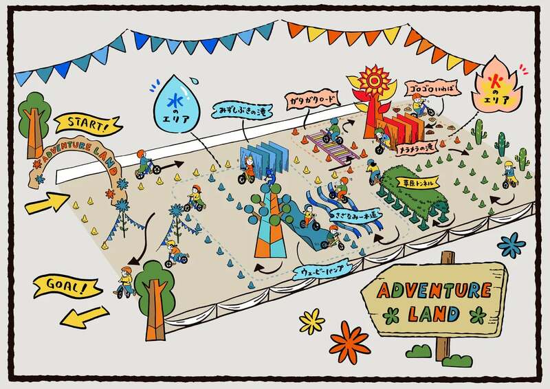 会場内には、誰でも参加できる巨大試乗体験コース「アドベンチャーランド」が登場します。全長100mを超えるコースは、「火のゾーン」と「水のゾーン」で構成され、7つのチャレンジポイントが待っています。
