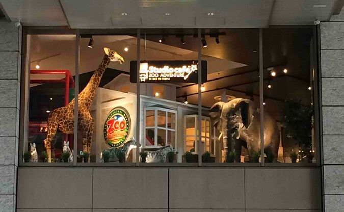 JR「大阪駅直結」の「ルクアイーレ」にある「Studio Cafe ZooAdventure」は、動物モニュメントが目印。