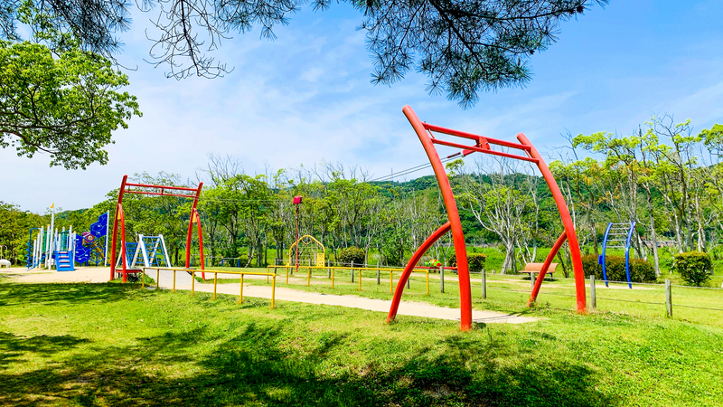海の生き物がモチーフのコンビネーション遊具やザイルクライミング、ボルダリングなどの遊具が充実しており、芝生広場にはロングローラーすべり台もあります。