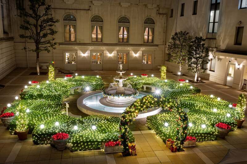 本館中庭に合計1万5,000球の煌めく光が登場し、ヨーロッパ調の庭園をロマンティックな空間に演出します。2025年12月25日(木)までの期間は、光のアーチやギフトボックスなど、クリスマス仕様の特別バージョンを展開。タワー館1階ロビーでは「クリスマスツリーデコレーション」も設置されます。