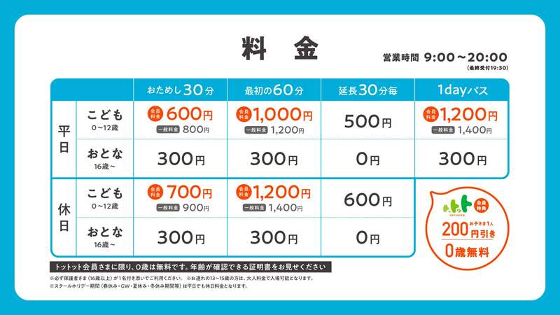 子育て応援アプリ「トットット」に会員登録すると会員価格で利用できます。0歳のトットット会員は入場無料です。