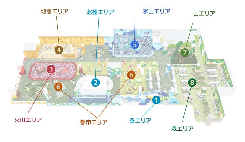 施設内には「空」「北極」「火山」「地層」「氷山」「都市」「山」「森」の8つのエリアが用意されています。