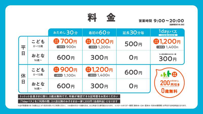 子育て応援アプリ「トットット」に会員登録すると会員価格で利用できます。0歳のトットット会員は入場無料です。