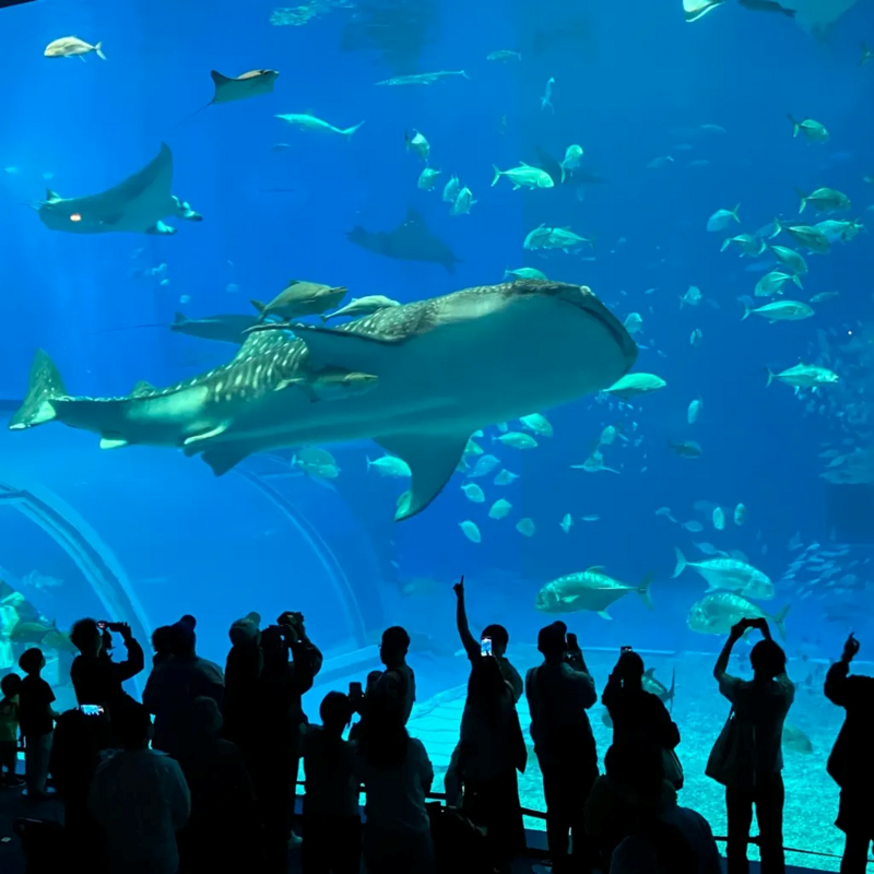 「沖縄美ら海水族館」は、海洋博公園内にある人気スポットです。太陽の光が降りそそぐ「サンゴの海」では450群体のサンゴを、大迫力の「黒潮の海」では魚類最大のジンベエザメや世界初の繁殖に成功したナンヨウマンタを観察できます。