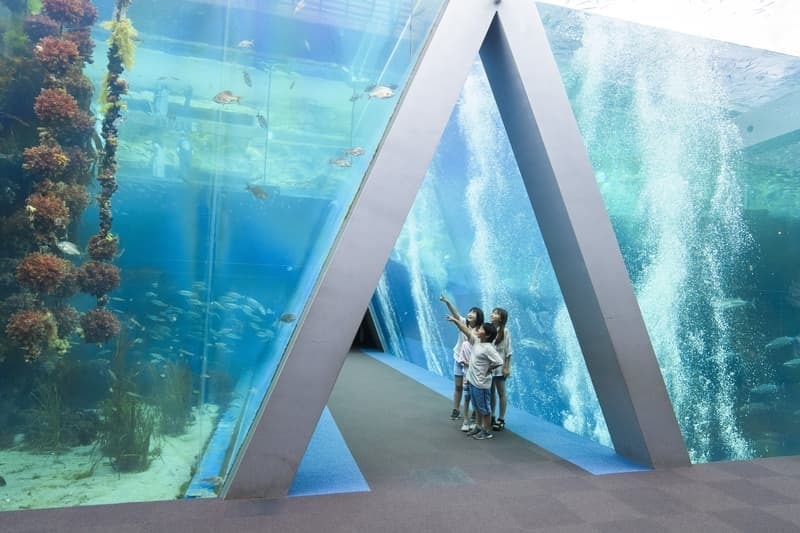 メイン水槽は総量2050tの大水槽で、三角トンネルをはさんで黒潮水槽と親潮水槽に分かれています。