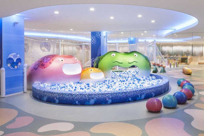 館内は下関の海をイメージしたデザインで、ボールプールやネットの大型遊具など就学前の子どもが楽しく遊べる「プレイランド」が充実しています。