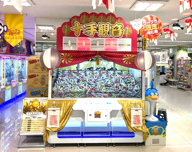 「爆獲横丁」には山口県最大級222口のクレーンゲームが勢揃い。10本アームの話題の「十手観音」山口スペシャルバージョンや、10円で遊べる「拾円市場」など、クレーンゲーム初心者のお子さんでも楽しめる工夫がいっぱい。