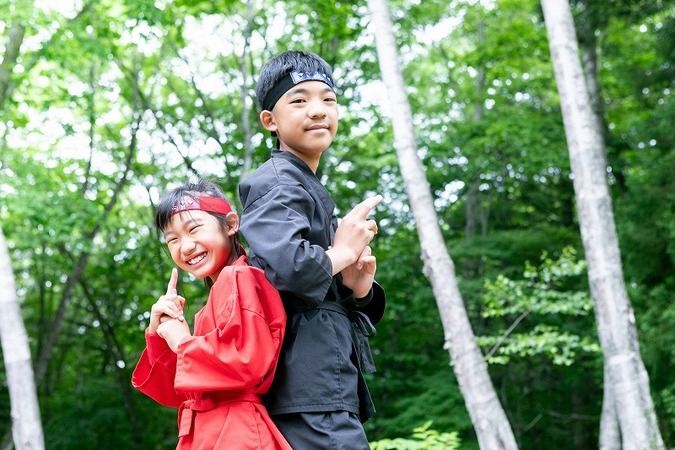 「修業の森アスレチック」では自然の中で思いきり体を動かせ、忍者服のレンタルで記念撮影も可能。小さなお子さんから祖父母世代まで、家族みんなで遊んで学べる一日中楽しめるスポットです。