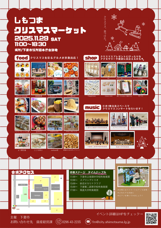茨城県下妻市の「下妻市役所 旧本庁舎跡地」で、2025年11月29日(土)に「しもつまクリスマスマーケット」が行われます。