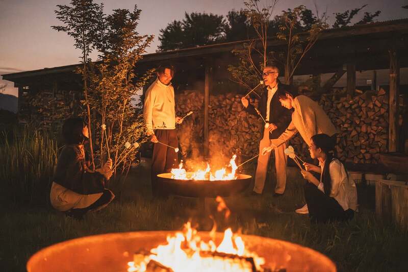 レストランでは毎日焚き火を開催中です。マシュマロ(300円)や自家製ベーコン(650円)、カマンベールチーズに加えて、きりたんぽも登場します。焚き火の爆ぜる音に耳を傾けながら、温かい時間を過ごせます。