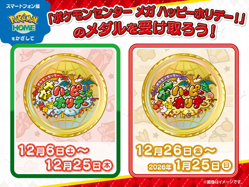 イベント期間中、スマートフォン版『Pokemon HOME』を専用パネルにかざすことで、「ポケモンセンター メガ ハッピーホリデー!」のロゴ入り特別メダルを受け取ることができます。受け取れるメダルのデザインは期間によって異なります。