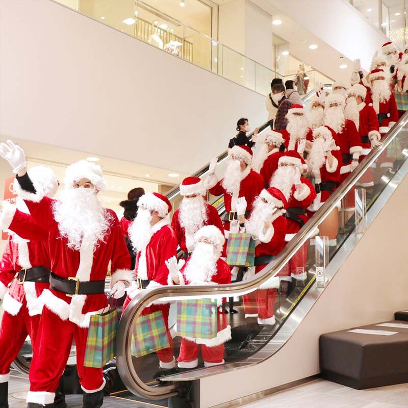 従業員が扮した20名のサンタクロースが、2階から11階まで続く全長約160メートルのエスカレータを一斉に下る迫力満点のイベントです。