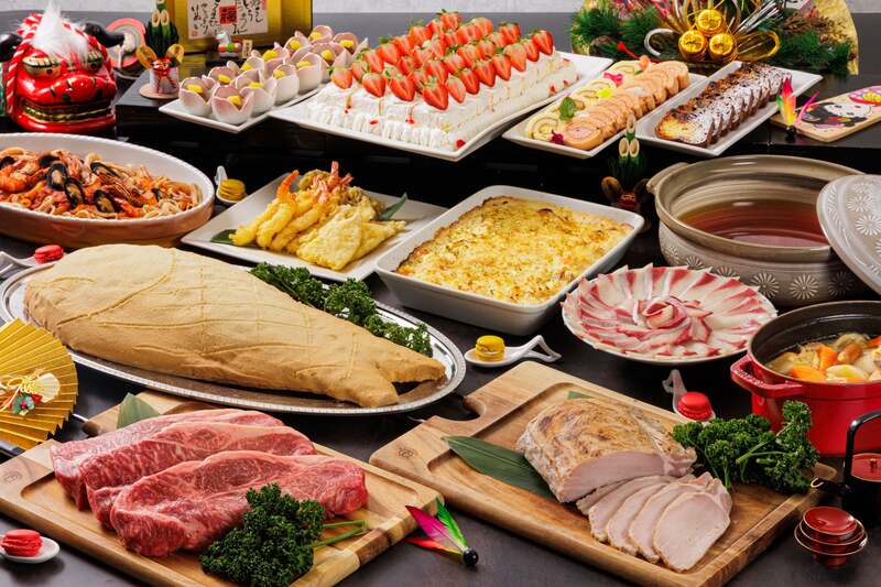 はりま牛の鉄板焼き、めで鯛の塩釜焼き、ブリのしゃぶしゃぶ、にぎり寿司、ローストポーク、天ぷら盛り合わせ、パンケーキマシン、フライドチキン&ポテト、チキンステーキ、シーフードグラタン、パスタ、いちごのスクエアショートケーキ、紅白に見立てたロールケーキ、フルーツジュレ、栗きんとん、伊達巻など