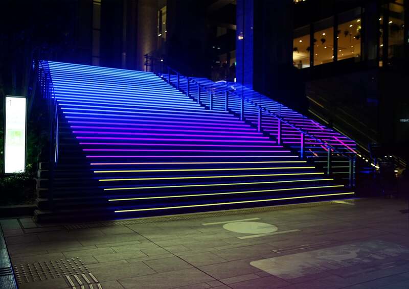 大階段では、昨年までの青一色とは異なり、RGBライトの色がクリスマスソングを含むBGMとともに次々と変化します。