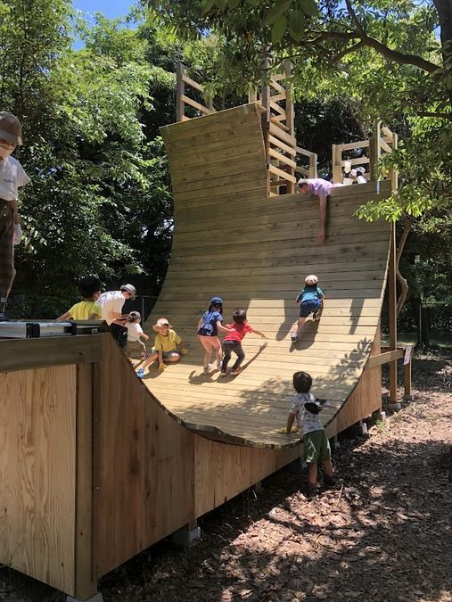 飛行船型のジャングルジム「ツェッペリン号」やローラー滑り台など、子供に人気の施設もあり、家族みんなで楽しめる公園です。