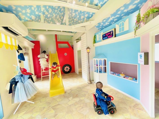 スーパーマーケットやアイスクリーム屋さん、消防車の梯子や滑り台など、職業体験ができる施設が充実。無料貸出の衣装でドレスアップも楽しめます。大人はキッチン付きカフェでくつろぎながら子どもを見守れるので、ママ会にもぴったり。