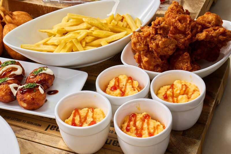蟹の氷台盛りや寿司、牛サーロインなどの豪華グルメに加え、たこ焼きやスパゲッティ、チキンナゲット、フライドポテトなど子供向けメニューも充実!