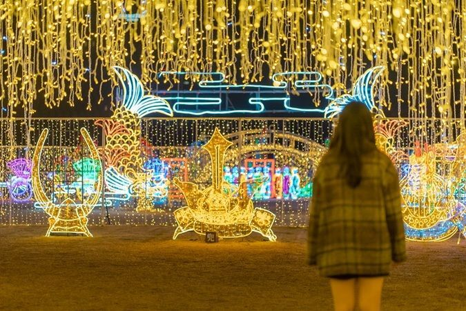 金色のトンネルや将軍・侍をテーマにした大阪ならではの光の演出が楽しめます。光のシーソーで遊べるインターアクティブエリアや、大阪の言葉が並ぶフォトスポットも人気。フードトラックで食事もできるので、子供から大人まで家族みんなで楽しめるイルミネーションスポットです。