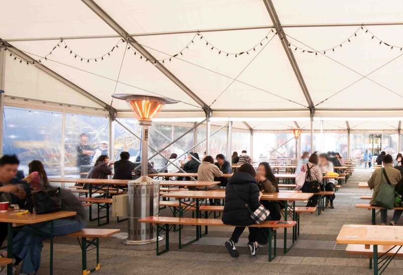 約200名が利用できる大型防風テントには、複数のストーブを設置。外の空気が冷え込む時間帯でも、イベント気分をそのままに温かな室内で食事やドリンクを楽しめます。
