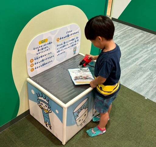 そのほか、モニターに映し出された牛のフンを体を動かしてお掃除するARゲーム「おそうじチャレンジ」や、酪農について学べる「学びパネル」、ミルクジャパンのキャラクターが登場する4種類の「ぬりえ」も用意されています。