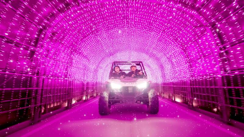 色とりどりの輝きがトンネル状に連なる幻想的な空間を抜けながら、バギーで夜のパーク内を駆け巡ります。