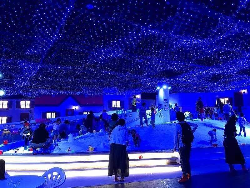 スノータウンでは、人工雪の上でそりすべりや雪だるま作りが楽しめます。長靴とそりの無料レンタルがあるので、荷物を減らしたいファミリーにもぴったり。室内なので天候に左右されにくく、小さな子供の雪遊びデビューにも安心です。