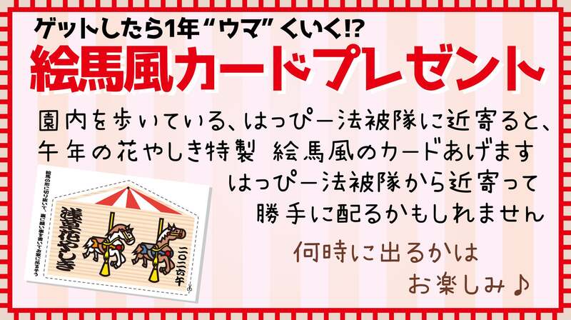 期間中は、園内のどこかに現れる「はっぴー法被隊」に、2026年の干支を答えると「絵馬風カード」がもらえます。