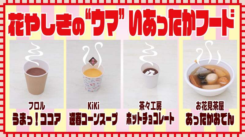 園内の各飲食店舗では、体が温まるフードメニューを提供。「うまっ!ココア」(フロル・500円)、「迎春コーンスープ」(KiKi・450円)、「あったかおでん」(お花見茶屋・800円)、「ホットチョコレート」(茶々工房・600円)など、冬の遊園地を満喫できるメニューが揃っています。