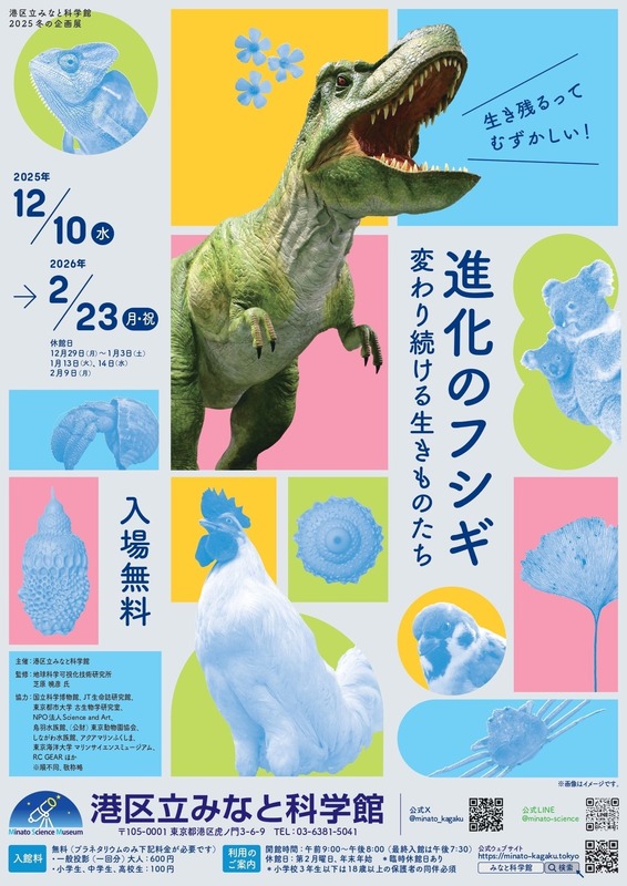 東京都港区虎ノ門の港区立みなと科学館で、2025年12月10日(水)〜2026年2月23日(月・祝)まで、冬の企画展「進化のフシギ〜変わり続ける生きものたち〜」が開催されます。