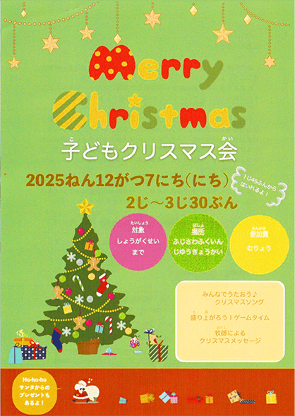 藤沢福音自由教会が、地域の子供たちを対象としたクリスマス会を開催します。クリスマスの「良き知らせ」の喜びを子供たちと分かち合うイベントで、参加費は無料です。