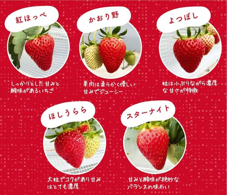 いちご狩りでは、紅ほっぺ・かおり野・よつぼし・ほしうらら・スターナイトの最大5種類のいちごを40分間食べ放題で楽しめます。山間の寒暖差が大きな気候により、甘みをたっぷりと蓄えたいちごが育っています。