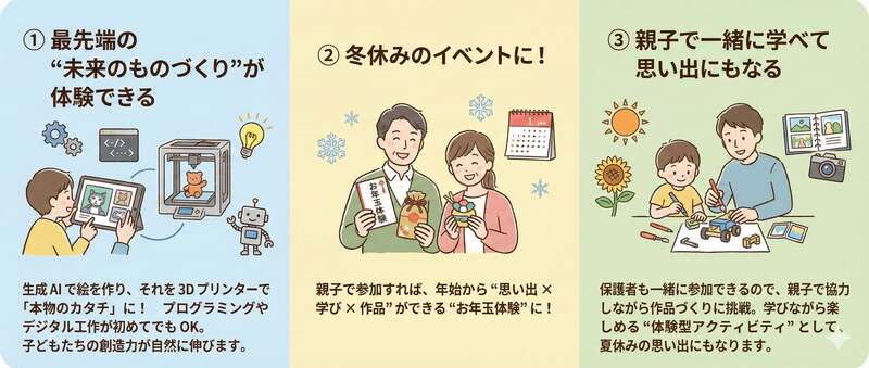 新年最初のものづくり体験として、生成AIで作った絵を3Dプリンターで本物のカタチにする、未来のクリエイター体験ができるイベントです。
