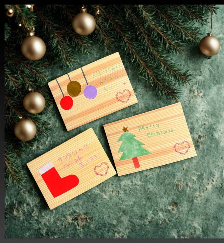 木のクリスマスカードづくりでは、徳島県産材でつくられた"樹の紙(ハガキ)"に折り紙と色鉛筆でデザインします。作ったカードは持ち帰ることができます。