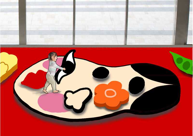 日本の伝統的なお正月の遊び「福笑い」がビッグサイズになって登場し、目や鼻など顔のパーツだけでなく、おせち料理の具材をイメージしたオリジナルクッションも自由に配置しながら、作品を完成させていきます。