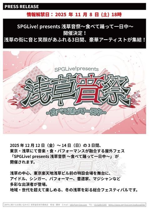 2025年12月12日(金)・12月13日(土)・12月14日(日)の3日間、浅草六区ブロードウェイ 特設会場(屋外ステージ)で、「SPGLive! presents 浅草音祭 〜食べて踊って一日中〜」が開催されます。