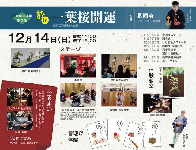 太神楽や和楽器演奏、芸者の踊りなどのステージイベントや、あやとりやけん玉などの昔遊び体験、版画刷りや苔玉作りの体験教室も。