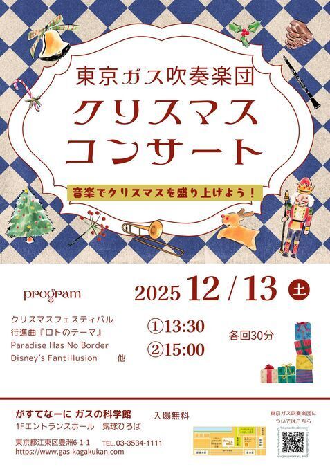 2025年12月13日(土)に、がすてなーに ガスの科学館1階「気球ひろば」で、東京ガス吹奏楽団による「クリスマスコンサート」が開催されます。