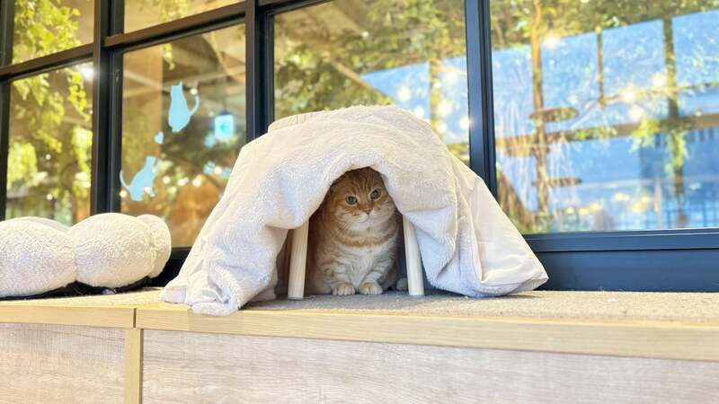 カワスイのソラネコカフェには猫用こたつが設置され、猫たちがこたつでくつろぐ様子を間近で見たり、写真を撮ったりできます。猫とこたつという冬の定番の組み合わせで、まったりした雰囲気を楽しめます。