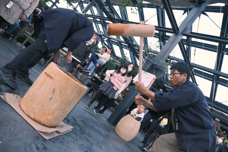 フラワーパークのある茨城県八郷地区の伝統にならい、「蒸す」「練る」「餅をつく」という昔ながらの餅つきが行われます。