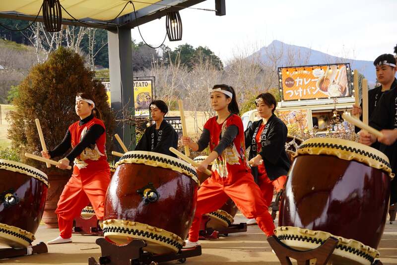 1月4日(日)14時からは、グリーンヒルに響き渡る「小川和太鼓」の迫力満点の演奏でイベントがスタートします。レストランのテラスで鑑賞でき、子供も太鼓の体験に参加できます。