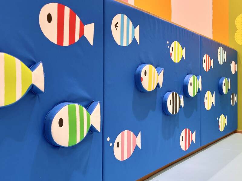 天井に設置された鏡で家族で寝ころびながら記念写真を撮ることができたり、マットの上で自由にハイハイしたり、おさかなさんの壁でつかまり立ちの練習ができるなど、さまざまな遊びが楽しめます。