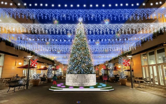 「トレッサ横浜」では、毎年恒例の欧風イルミネーションを実施中です。南棟センターガーデンには、巨大クリスマスツリーと、子供が楽しめるステップライトが登場。