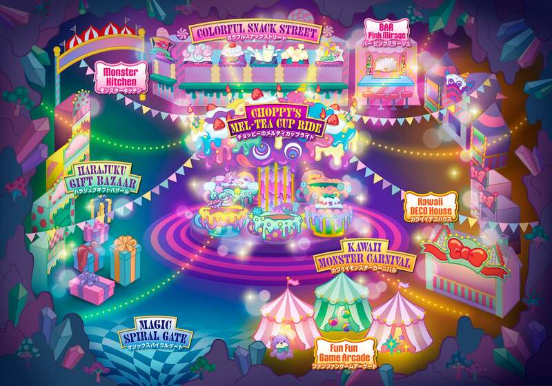 モンスターたちの世界へとつながる「Magic Spiral Gate」、ゲームや、デコが楽しめる屋台ストリート「Kawaii Monster Carnival」、KAWAIIアイテムや原宿土産が買える「Harajuku Gift Bazaar」、フードやドリンクを楽しめる「Colorful Snack Street」など、多彩な体験が用意されています。